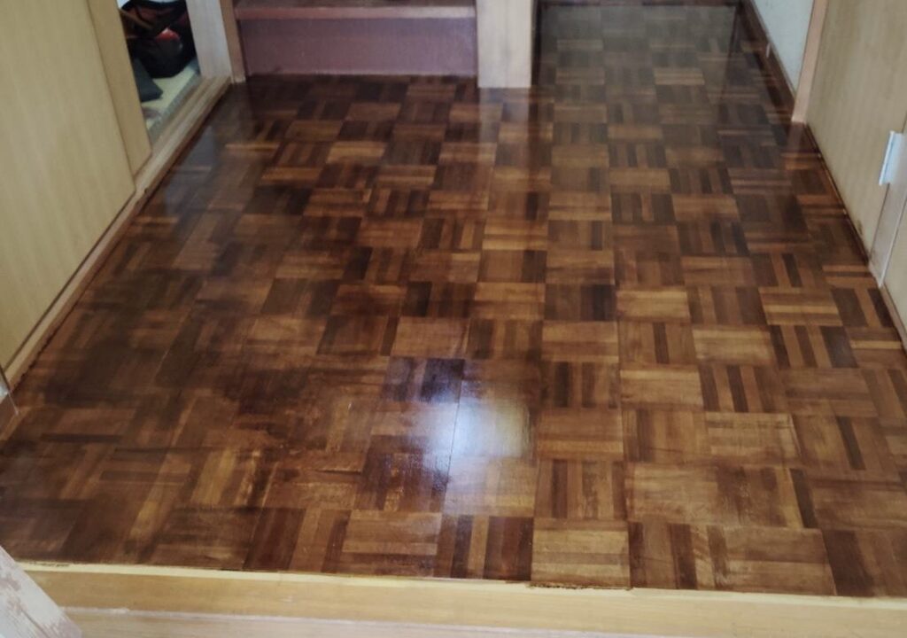 ここが古い印象だと、家全体が暗く見えてしまいます。私たちは、まず床の表面を丁寧に清掃・調整し、専用のニスで仕上げることにしました。